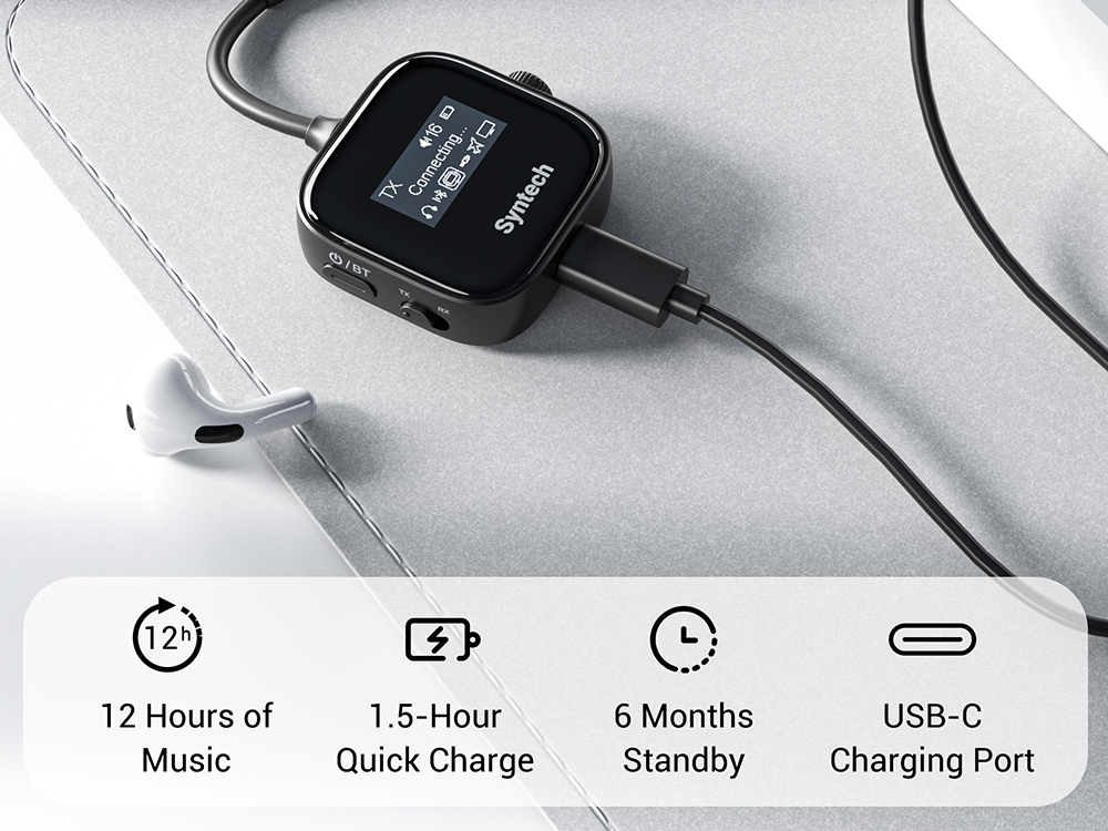 飛行機、テレビ、コンピューターからのオーディオをワイヤレス ヘッドフォンにストリーミングする送信モード (TX) と、車、アンプ、スピーカーを Bluetooth 対応デバイスにする受信機モード (RX) を簡単に切り替えることができます。